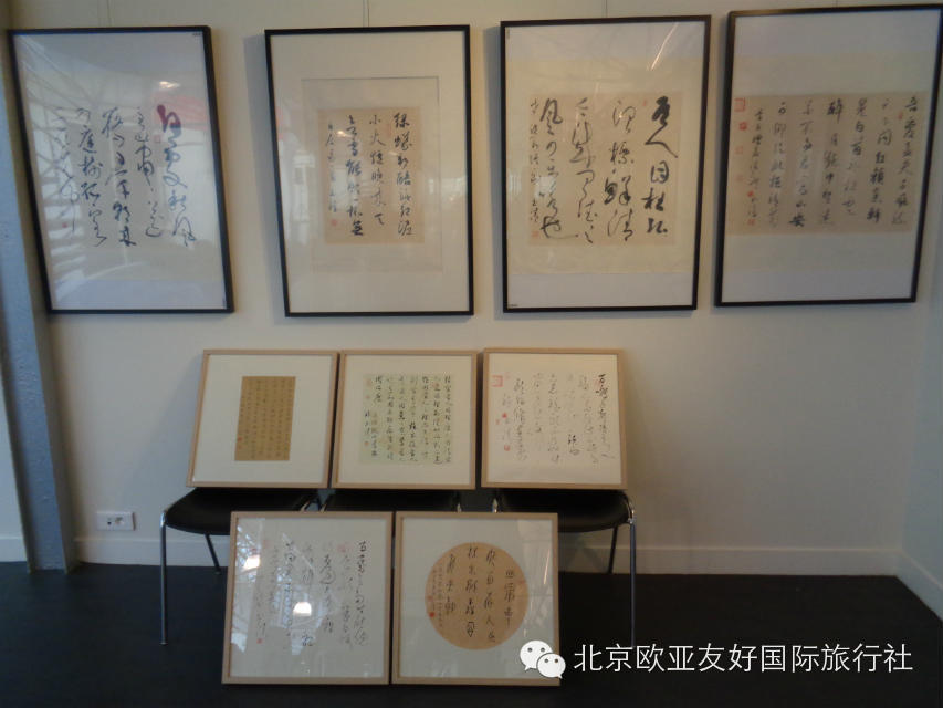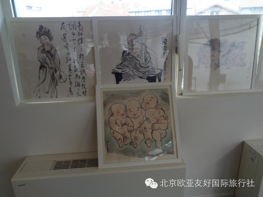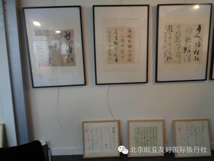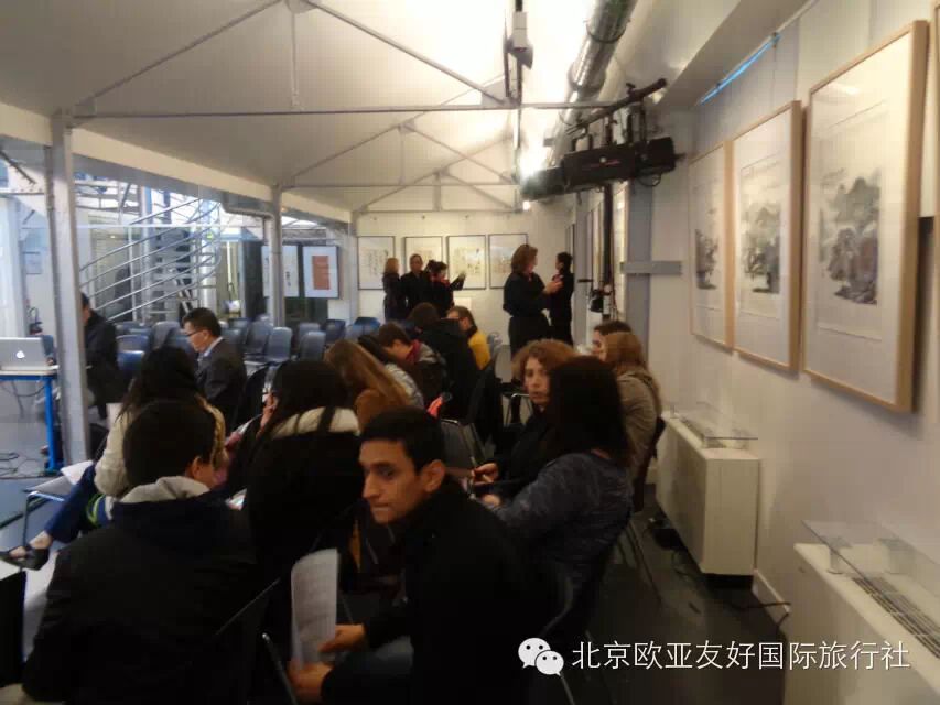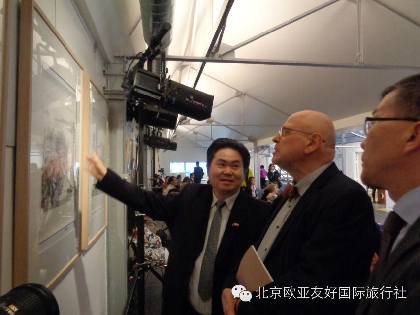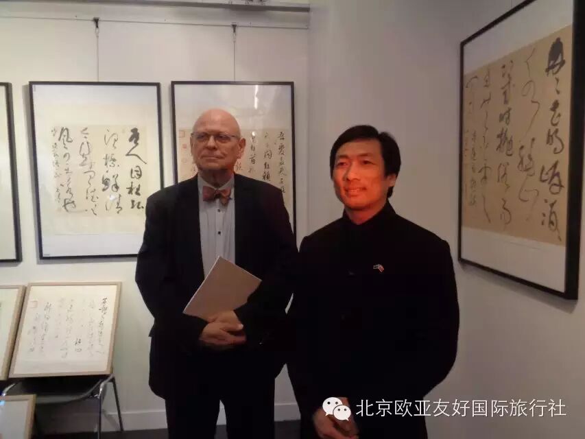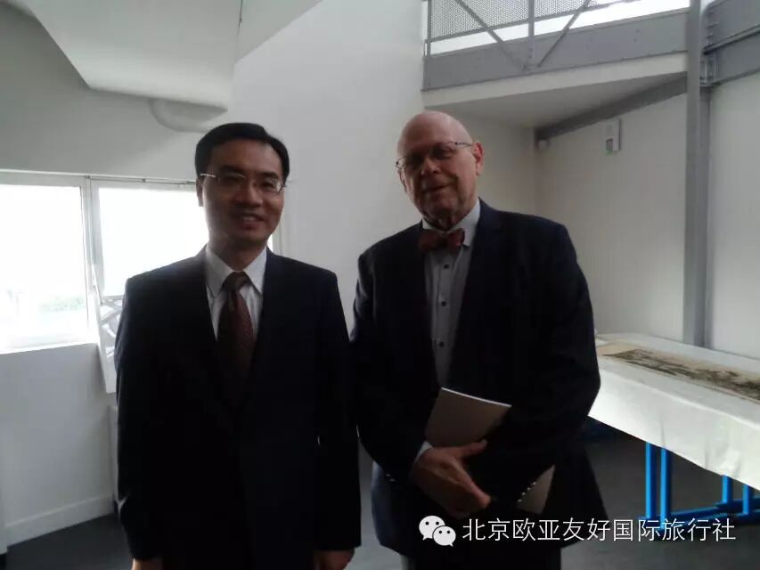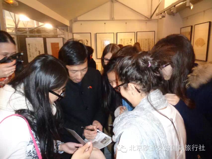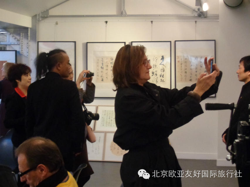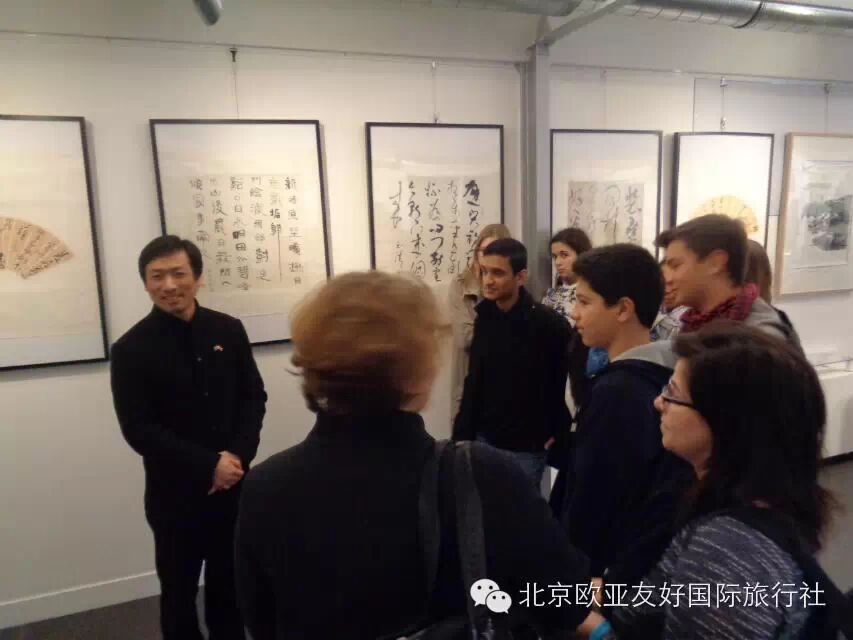 各位艺术家向让.阿兰.杜索主席介绍中华艺术及出展艺术品。