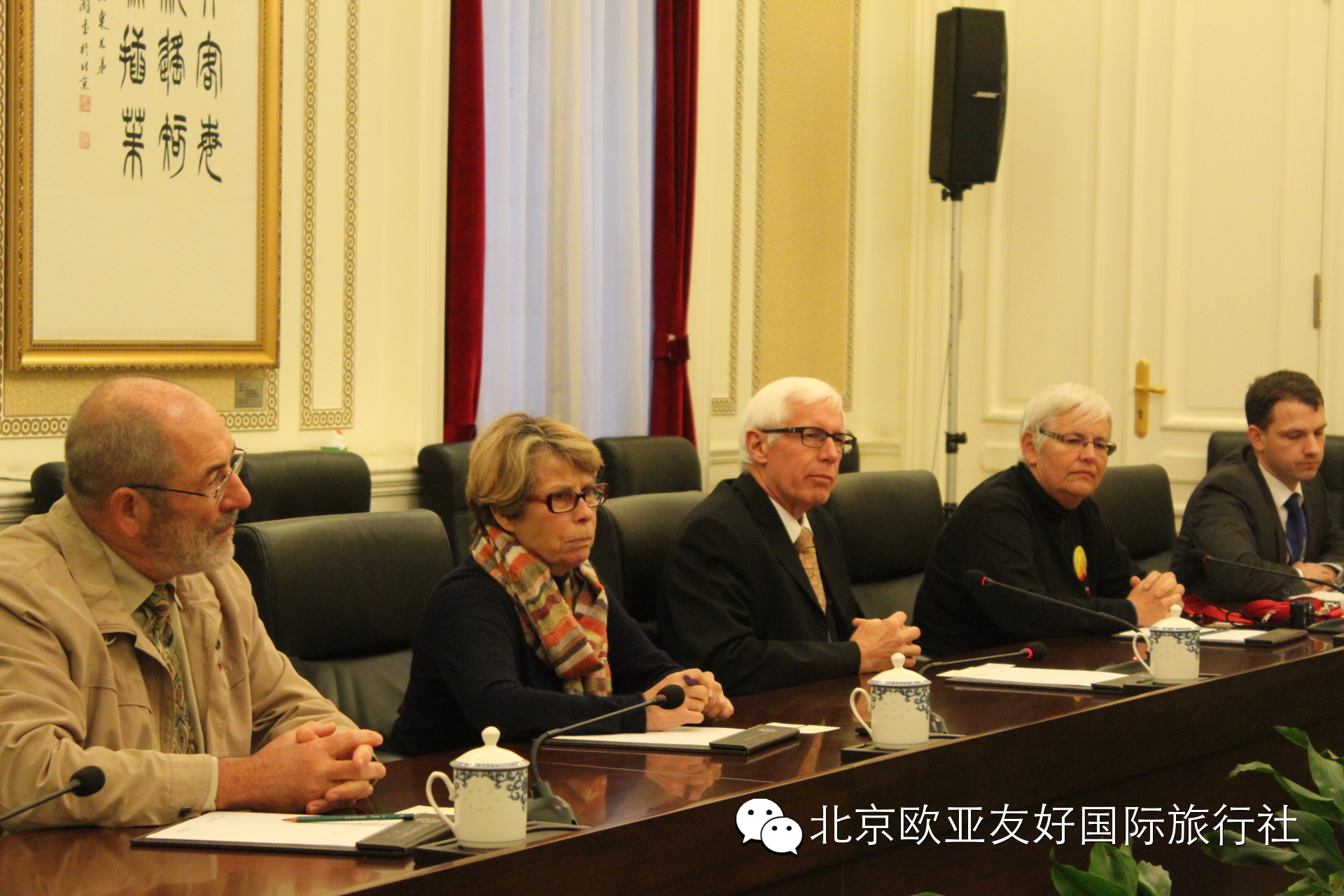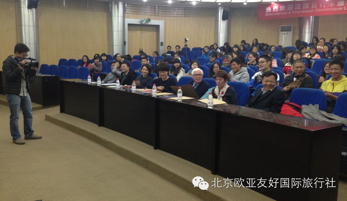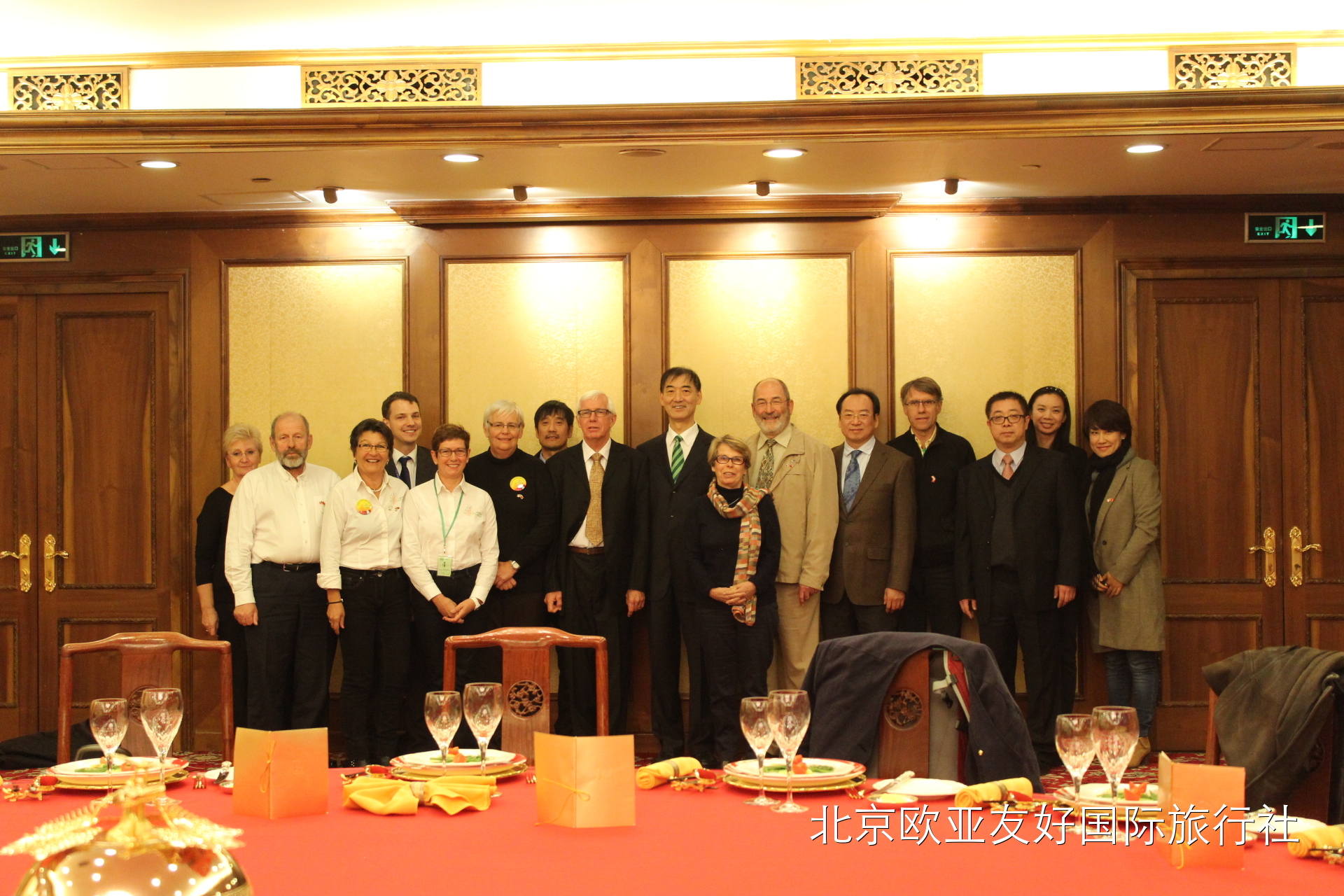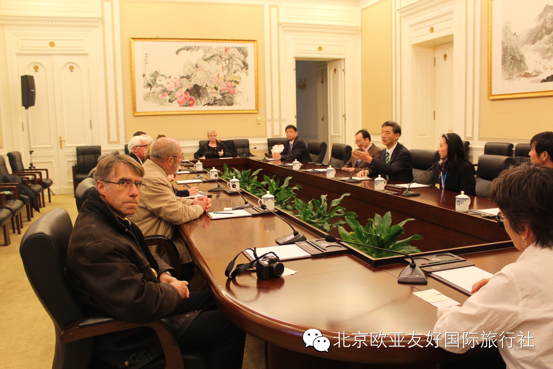 2014年11月11日,刚刚结束在天津黄崖关的骑游交流活动,各方领导又在北京相聚,在全国人民对外友好协会亲切会面、友好交流。全国对外友协副会长李建平、欧亚二部主任宋敬武、康景远处长;法国代表为:全法自行车旅游联合会主席一行7人领导代表团、全法徒步旅游联合会主席与旅游部部长参加会面会议,法国驻华领馆北京驻华大使二等秘书Jadot先生也应邀来与各位领导亲切交谈。全法自行车旅游联合会主席、副主席、各领导、与全法徒步旅游联合会主席等与友协领导亲切会谈,答谢长达10年的合作与支持;希望加强交流与合作;为中法建交在体育、旅游领域内有更好的发展!